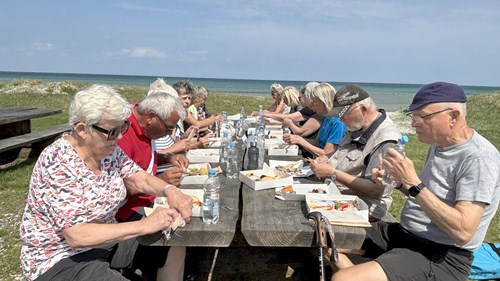 Efter ca. 10 kilometers vandring nåede vi Bønnerup Havn og Marina, hvor der var mulighed for at nyde den medbragte frokost eller købe måltid i fiskeforretningen. Formiddagens etape bød på varieret natur, skov strand, vindmøller ved Bønnerup Havn og en smuk kystudsigt.